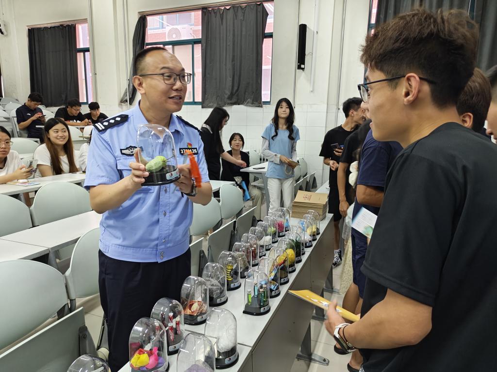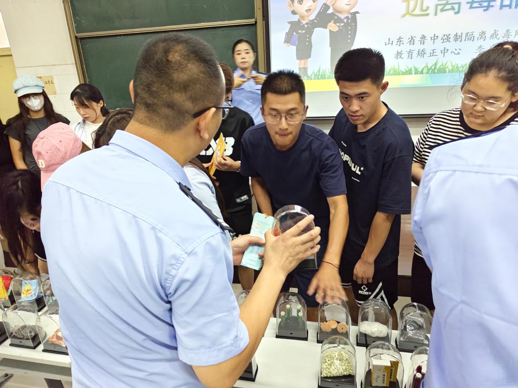 在互动环节,同学们积极提问,与警官进一步探讨关于禁毒的各种问题,近距离参观毒品样本,现场气氛活跃。