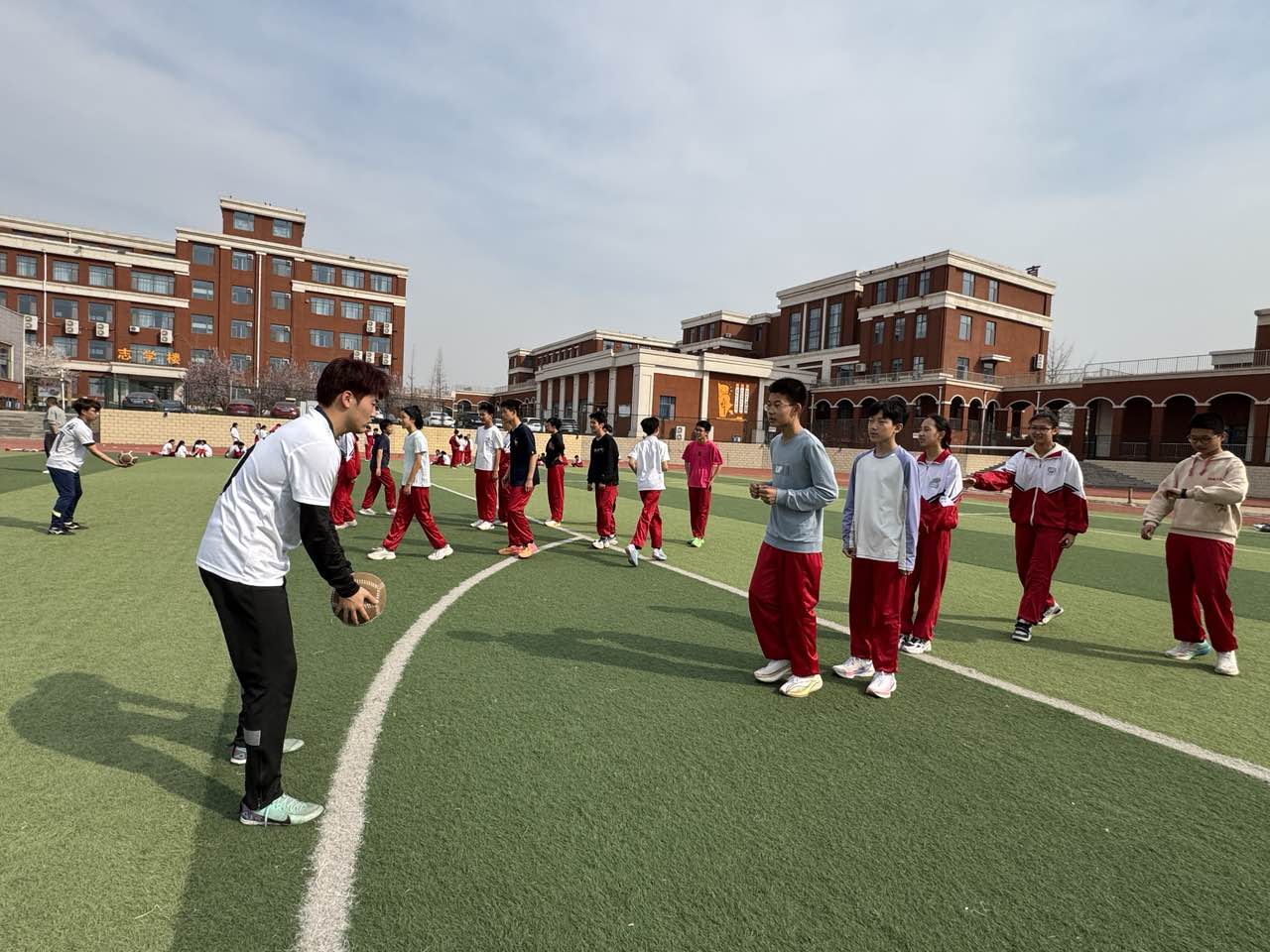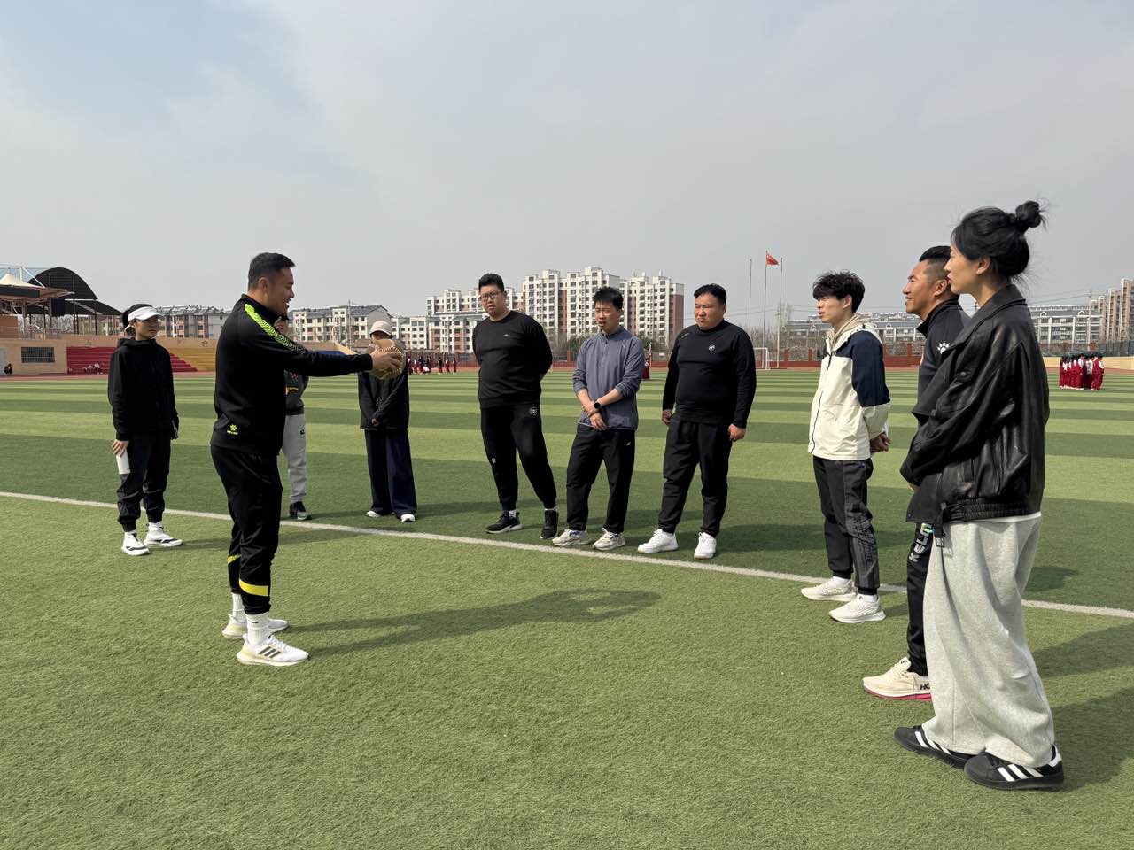 启动仪式结束后,淄博师专蹴鞠队为附中师生带来了精彩的技艺展示,受到师生的热情欢迎。蹴鞠队教练员现场与附中体育教师交流训练经验和技艺方法,蹴鞠队员们与同学们一同练习蹴鞠,让大家感受中华优秀传统体育项目的魅力。