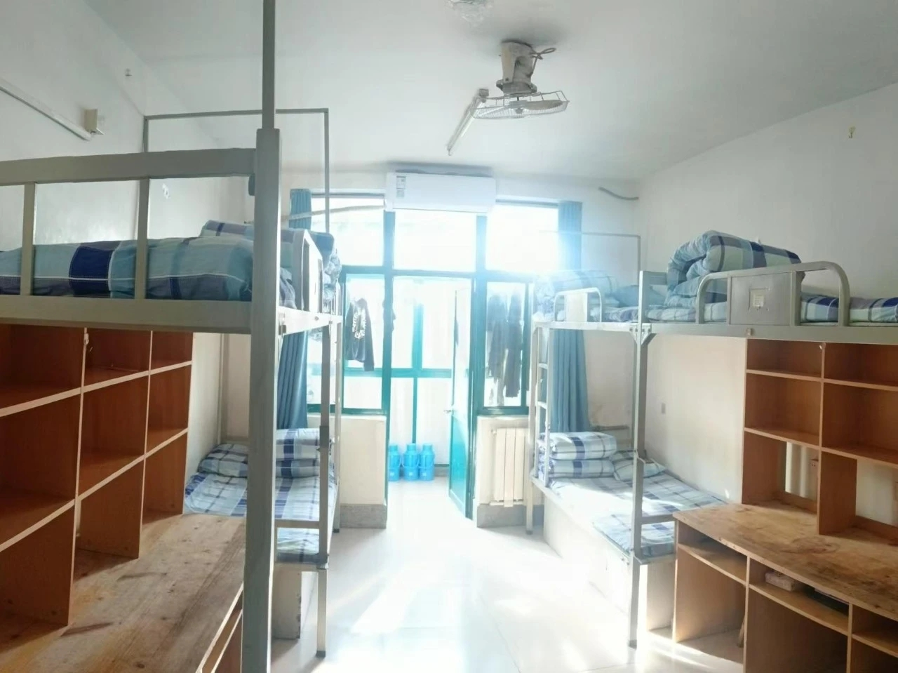走进文明宿舍,首先映入眼帘的是干净整洁的地面,没有一丝垃圾和灰尘。床铺平整,被子叠得方方正正,宛如一个个豆腐块,整齐地排列着。书桌上的书籍、文具摆放有序,衣柜里的衣物也收纳得井井有条。卫生间和洗漱区域更是一尘不染。